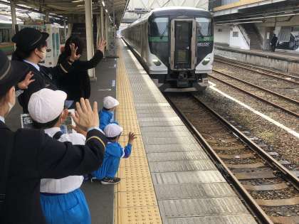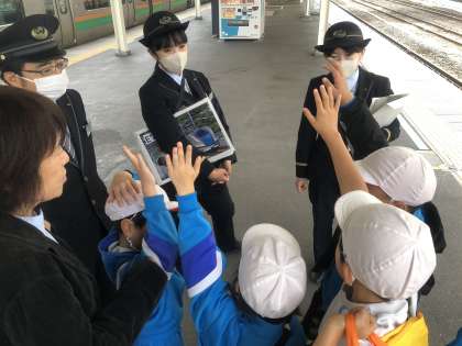 11月15日(金) 2年生校外学習「高崎駅見学終了」 公開日 2024/11/15 更新日 2024/11/15 できごと 特急を見たあとも、たくさん質問していた子どもたちでした。楽しく駅の様子を学習できました。高崎駅担当の皆さま、ありがとうございました。