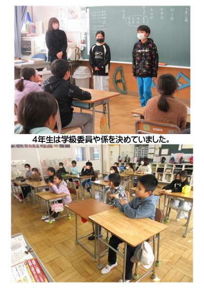 1月7日(火) 学級活動(4・5・6年生) 公開日 2025/01/07 更新日 2025/01/07 できごと 4・5・6年生の学級活動の様子です。学級委員・係決めの話合いや3学期のめあてを書いていました。上学年の頼もしさが感じられました。