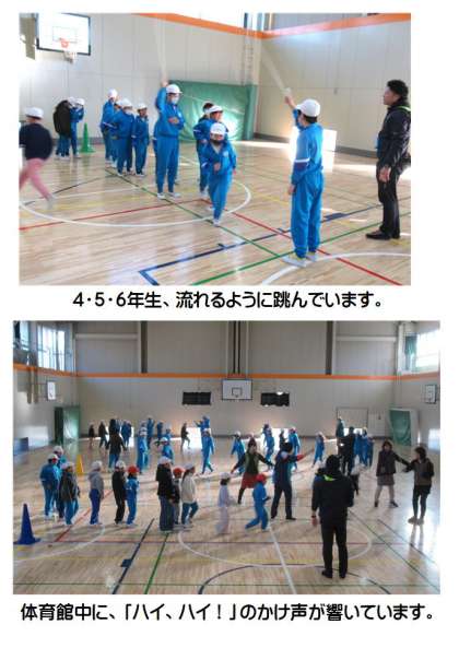 よいお手本を見た後、それぞれのチームで練習しました。1年生もリズムよく跳んでいます。最後に、3分間で何分跳べるかに挑戦しました。初めての練習でしたが、どのチームも100回を超える記録に、子どもたちはもちろん、先生たちも「すごい!」と感激していました。今年度の長縄集会は、チームでの勝負ではなく、自分たちの記録をどこまで伸ばせるかに挑戦します。長縄集会は(記録会)、1ヶ月後の2月26日(水)です。このあとは、休み時間に校庭で練習する姿が見られることでしょう。