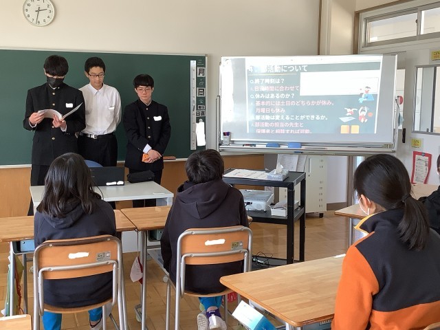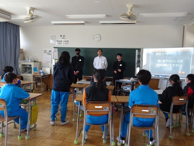 3月14日(金) 6年生「中学生訪問」 公開日 2025/03/18 更新日 2025/03/16 できごと 6時間目の総合の時間に、昨年度卒業した中学一年生の先輩達が来校し、6年生に向けて中学校生活についての話をしてくれました。久しぶりに会う先輩達に、少し緊張していた6年生ですが、話を聞くうちにだんだんと緊張も和らぎ、中学校生活について色々と質問することができました。