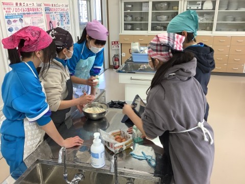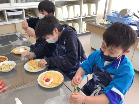3月18日(火)6年「調理実習①」 公開日 2025/03/18 更新日 2025/03/18 できごと 今日の3・4時間目の時間に、6年生による「調理実習」がありました。今回は「クレープ」作りです。最初は、薄く焼くのに苦戦していましたが、だんだんとコツを掴み、上手に焼けた時は、歓声があがっていました。また、焼けたいい匂いにつられて、家庭科室を覗きにくる下級生の姿も見られました。 +3