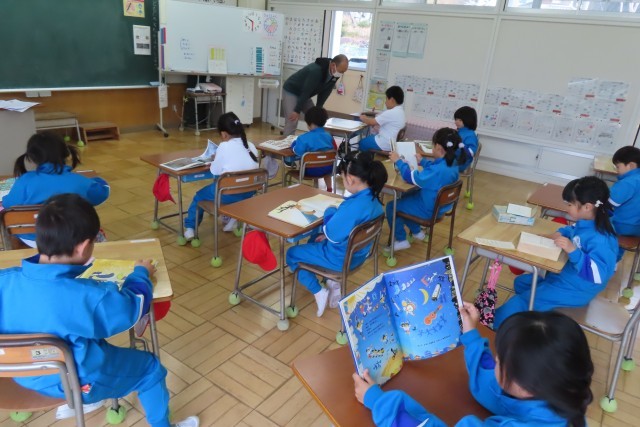 本が大好きな一年生!とってもよいですね!そんな1年生なので、担任の先生は朝、読み聞かせをしてくれます。入学してから毎日、笑顔ですてきな朝を迎えています。
