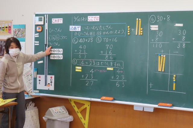 「2けたのたし算」では、いろいろなたし算の筆算の仕方を考えていました。先生からの問題に対して真剣に、本当に真剣に!考えていました。みんなが違う答えになったり、誰かが間違っていたりしても、そこからみんなで「どうして間違ったのかな」「何がみんなと違うのかな」というふうに学びます。学力がつく方法がよく身に付いていて素晴らしいと思います。みんなと一緒に学ぶからこそ、学習が深まります。