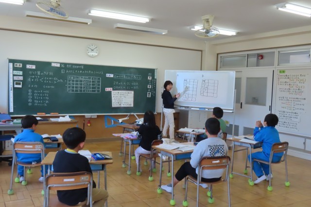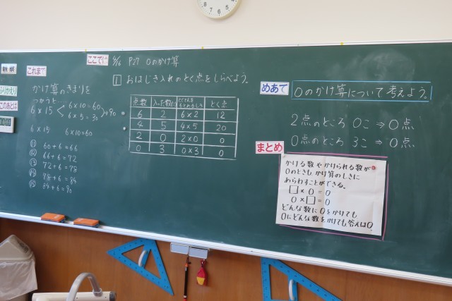 「かけ算」の学習では、0のかけ算について考えました。教室からは大盛り上がりで元気な声が聞こえてきます。「おはじき入れ」をしてその得点を出してみたことで、今日のめあては達成できたようです。しっかり式を立てて得点を出していたので、「ここでは」0のかけ算の理解は完璧です!