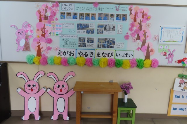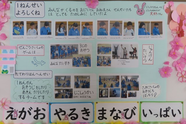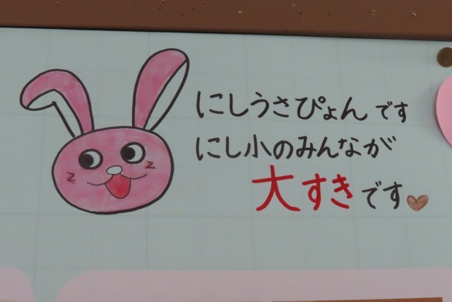 西うさぴょんと教務主任の先生が、すてきな掲示板をつくってくれました。昨日の「笑顔いっぱい」の朝の様子です。1年生を迎える会をはじめとして、みんなで楽しく過ごした様子です。1年生よろしくね!みんなで学校生活を仲良く、力あわせてやっていこうね!というメッセージにあふれている素敵な掲示板です。