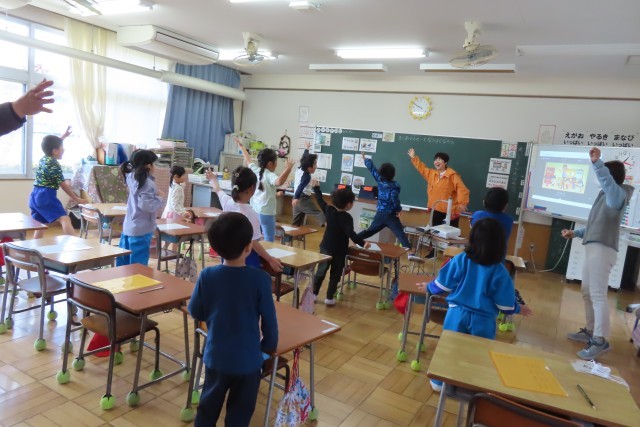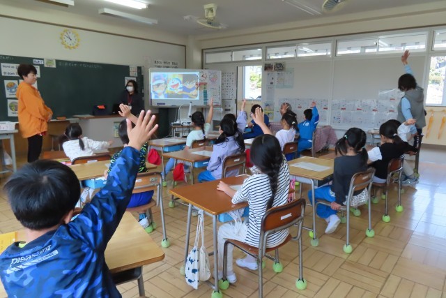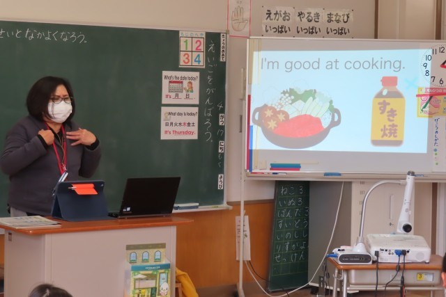 新しいALTの先生とのはじめての授業でした。英語の歌であいさつを楽しんだり、ALTの先生の自己紹介を、なんと!英語で聞いたりしました。1・2年生の児童にとっては英語ってたのしいな!などと、英語を使って人とかかわることの楽しさ、喜びをたくさん味わってほしいです。