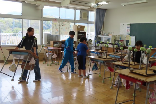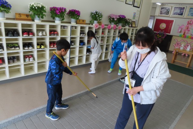 美九里西小学校では、清掃を「たてわり班」での活動としています。昨日から本格的に始めました。学年の枠を超えて、みんなで協力し合って活動する場面の多い本校ですが、この清掃は自慢の取組です。どの班も、無言で一生懸命に取り組みます。上級生が1年生にほうきの使い方、雑巾の絞り方を丁寧にやさしく教えています。低学年の子たちは上級生の清掃の仕方を真似して一生懸命取り組みます。みんなが気持ちよく過ごせるようにという思いはみんながもっています。それをみんなで一緒に協力しながら進めている美九里西小の児童は本当に素晴らしいです。