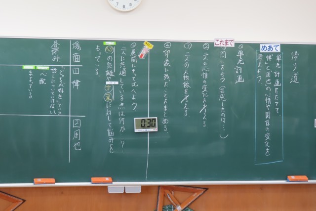 「帰り道」を学習しています。「ここでは」違う人物の視点で書かれた物語の構成のおもしろさを味わっいます。今日は展開に沿って、それぞれの場面での律と周也の心情を確かめて比べていました。同じ出来事を視点を変えて読むとどうかな?また自分はここが印象に残ったけど友達はどうかな?一つの物語を通して、その内容について友達と語り合うことも楽しいですね。