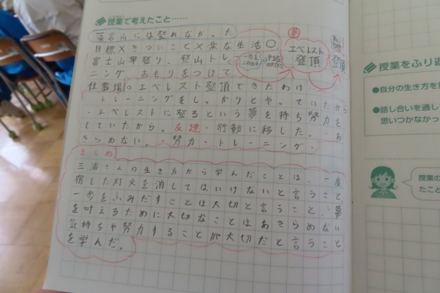 「夢に向かって」冒険家の三浦雄一郎さんの話を通して、「夢をもち続けること」を考えました。この春、新たな夢や希望のスイッチを押したばかりの6年生にとってはとても大切なことを考えることができた時間となったことでしょう。今日考えたことのように、これからもたくさんの人たちの生き方に触れ、自分の心と向き合う機会がもてるとよいです。ぜひご家庭でも、今日6年生が考えたことを話題にしていただき、子供たちの心強い応援団となっていただければと思います。