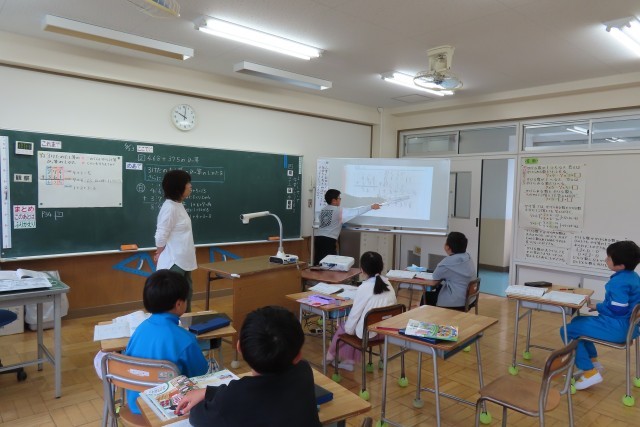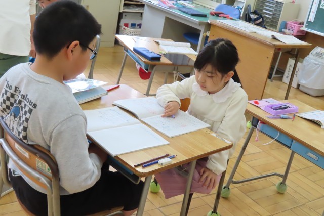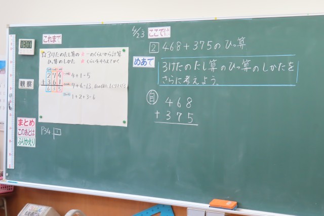 今日は、3けたのたし算の筆算の仕方を学習していました。まずは自分で考えて、友達同士で説明し合って、次にクラス全体に発表です。どう考えたか?いつものことですが、みんなきちんと言葉で説明することができました。中には、ノートに文章で書いたあと、「まだまだ考えてもいいですか」と図を使って考えていた児童がいました。そしてその図がかかれたノートを友達に見せながら、それを一生懸命自分の言葉で説明しようと頑張りました。素晴らしい!!!