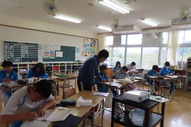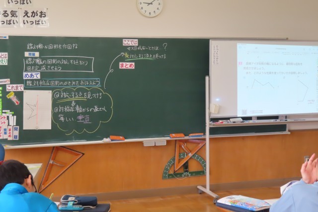 今日は線対称な図形のかき方を学習していました。大切なポイントを押さえながらかき、自分のかき方を友達に説明し、説明したことをノートに書いていました。口で説明はできるけれど・・・それを「まとめ」として書くのは、なかなか難しそうでした。でも諦めずに悩んで書いては消して書いては消してを繰り返しているうちに、「対応する点は」「対称の軸に」「垂直に」といったポイントの重要性がより理解、定着できるようになっていくのだと思います。