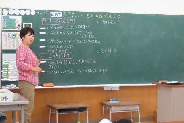「がっこうたんけん」で知りたいことを出し合っていました。先日、2年生に学校の中を紹介してもらったので、どこに何があるかは分かりました。さらに「きいてみたいな!」「しりたいな!」がたくさん出てきたようです。もっともっと学校のことを好きになってくださいね!