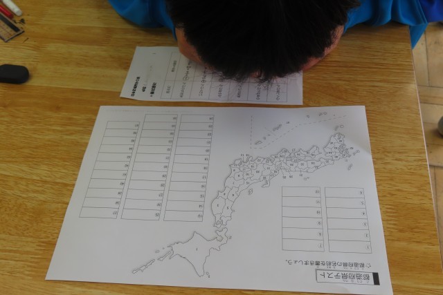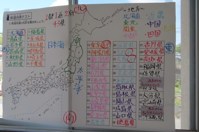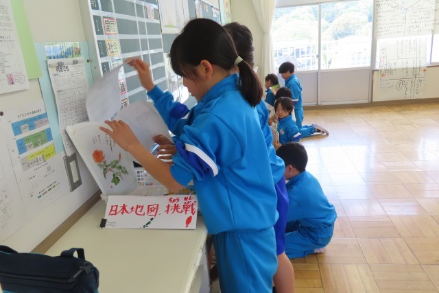 4年生では今、日本の都道府県の位置や漢字名を正しく理解して覚えられるようにとチャレンジ中です。先生からの「挑戦状」に、どの児童も「やる気いっぱい」にチャレンジしていました。昨日の下校時には、47都道府県の位置をドラえもんの歌のメロディーにのせて替え歌にしたものを歌っていた4年生でした。今、日本の地図(都道府県)に夢中です!