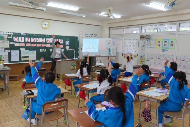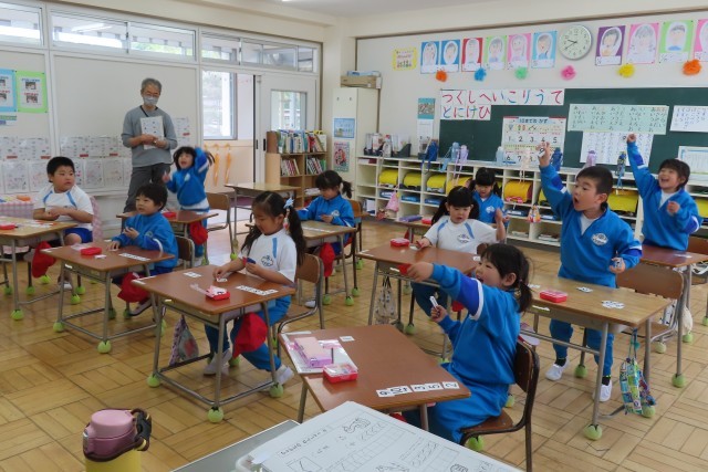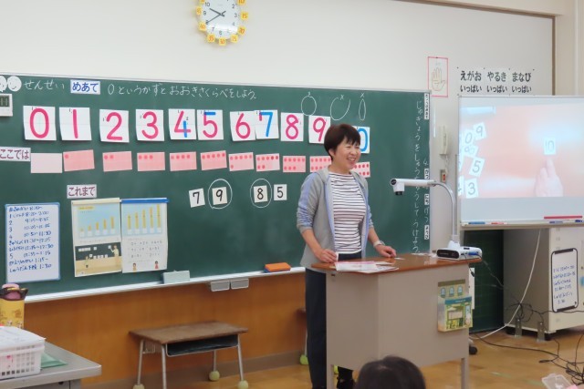 0から10までの数カードを使って、先生と数の大きさ比べ対決!をしていました。10回戦の勝負で、なんと9回先生に勝った児童がチャンピオンでした。「ここでは」1~10までの数の大きさ比べができるようになりました。「このあとは」数を使って、前から何番目などと順序や位置を表すことができるようになります。