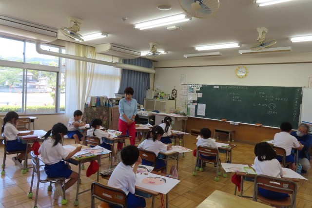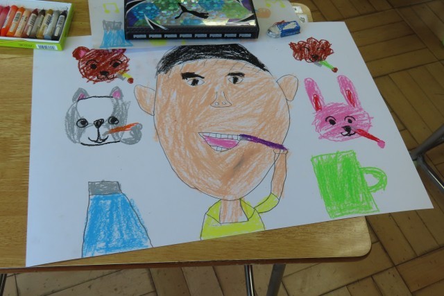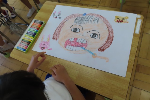 「むしばよぼう の えを かこう」です。画用紙いっぱいに絵を描きました。多くの児童の絵には、「にしうさぴょん」がいました。にしうさぴょんと一緒に歯みがきをしている絵です。上手に描けました!