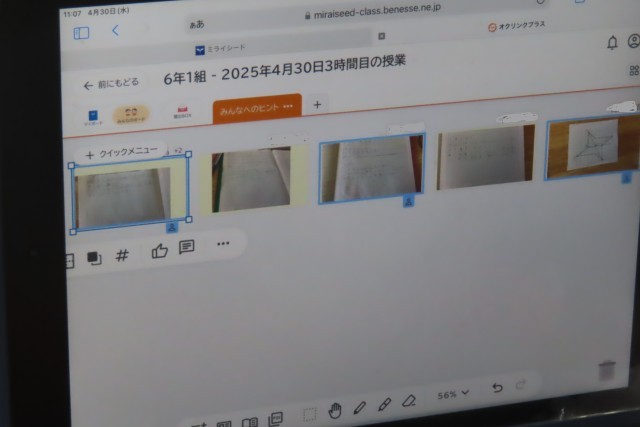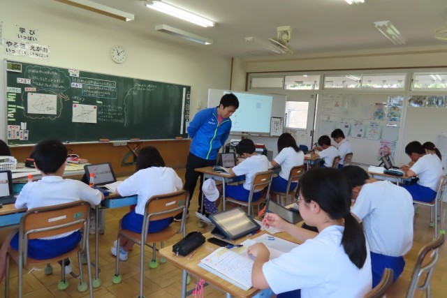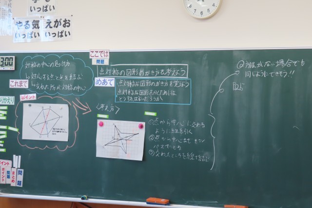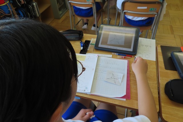 今日は点対称な図形のかき方を考えました。どうやってかいたらよいのか、自分でじっくり考えるのが基本ですが、どうしてもヒントがほしいときに、友達のかき方(タブレット上で共有)が役に立ちます。これは「つなぎ教材」といって、児童にとって課題を自分の力で解決するためのヒントになるものです。この「つなぎ教材」により、「自分でやってみよう!」「自分でできそうだ!」と「やる気いっぱい」に学べるようになることを目指しています。