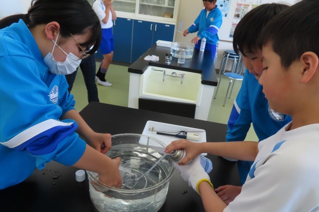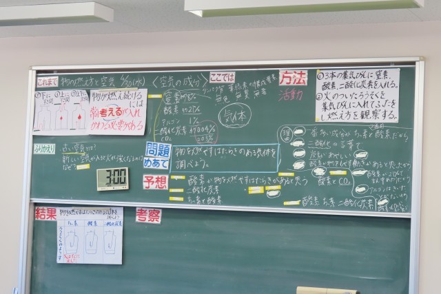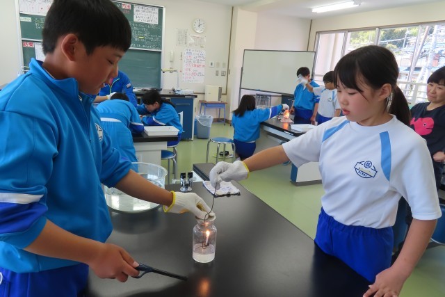 窒素、酸素、二酸化炭素について、物を燃やす働きがあるのかどうか実験しています。今日は酸素についてです。「ここでは」燃焼の仕組みについて学びます。ろうそくに火をつけた瞬間から観察の目が光っていた6年生でした。火はどう変化したか?いつ変化したか?炎の大きさはどうか?しっかりと見て、きちんと結果として言葉で表現することができました。この調子で、考察もバッチリ頑張ってほしいです。