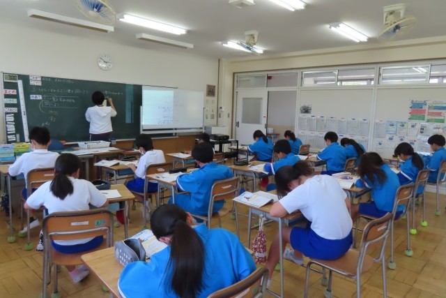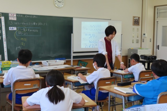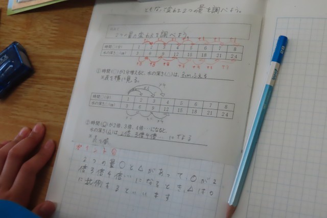 「2つの量の変わり方」の学習に入りました。「ここでは」比例の考え方と初めて出会います。水槽に水を入れる時間と水の深さについての表を見て、変わり方についてじっくり考えて自分の言葉で表してみました。それが比例の考え方でした。じっくり表を見て考えた分、しっかり理解、定着につながったことと思います。