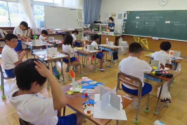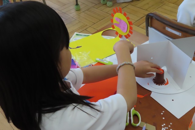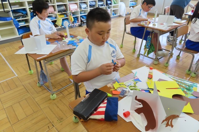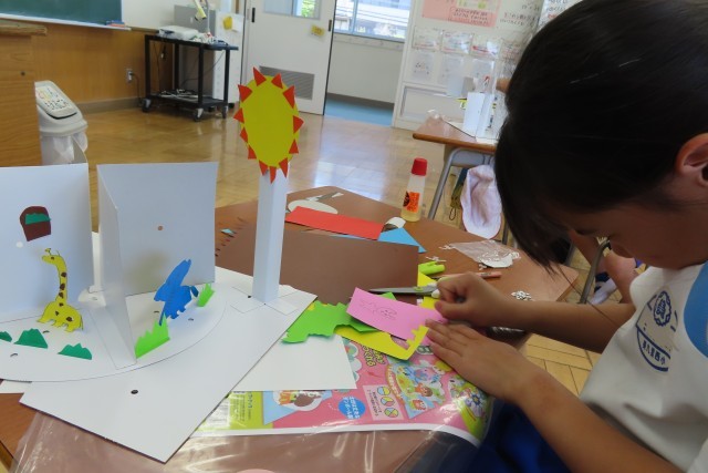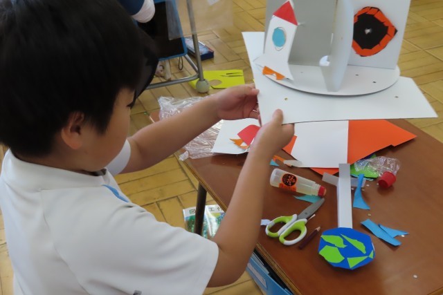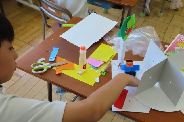 「わりピンワールドをつくろう」に入りました。自分で動かしてみながら、紙のつなぎ方や材料の使い方など工夫してつくります。まず材料を見て、自分がつくりたいものを想像し、つくり始めました。動物園や恐竜の世界、宇宙やまわるお寿司など、いろいろです。つくり始めると、どんどん自分のつくりたいワールドが仕上がっていきます。その早さに驚きました。今日はみんな夢中でつくっていたので、仕上がったみたら、どんな工夫をしたのかきいてみようと思います。