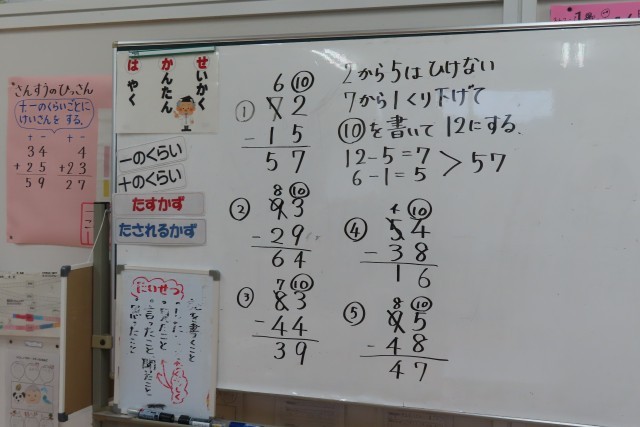 「まちがいは たから だね」と先生が言っていました。今日は、何十からひくときの筆算の仕方を考えました。そう簡単な課題ではありません。自分の考えが正しい答えにたどり着かなかったけれど、友達の考え方を聞いたら、分かりました。先生から言われなくても自分のどこが間違えたのかを考えたくなります。そして友達の間違いからも学びます。授業はみんなのものです!