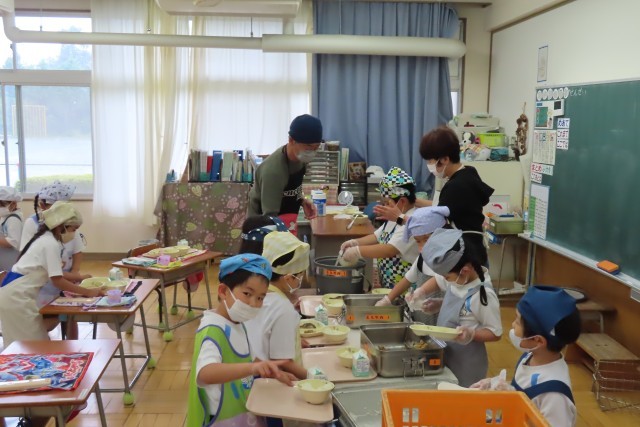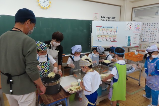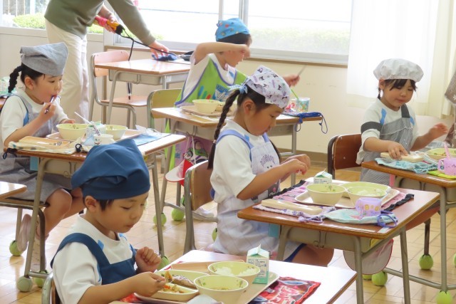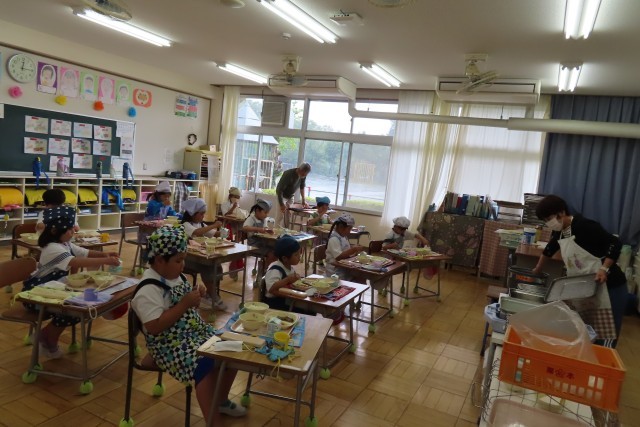 入学してまだ1ヶ月経ちませんが、日々、1年生の成長を感じます。給食の支度も早くなりました。先生と一緒に、みんなのぶんまで考えて丁寧に配膳ができるようになっています。今日は、たけのこご飯。みんな楽しみにしていた給食です。いただきます!