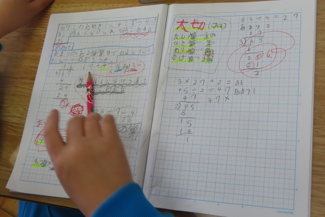「わり算の筆算」の学習では、あまりのあるわり算について考えていました。今日は、「商、和、差、積」の言葉、そして、あまりのあるわり算の答えは商とあまりの両方であることを学習しました。ちょうど教室では、振り返り問題にチャレンジし、先生から丸をもらって、教え合いが始まったところでした。このあと、どんどんわられる数が大きくなってもバッチリできそうですよ。