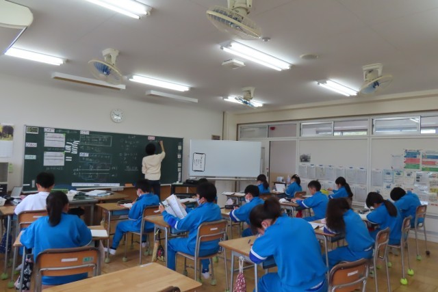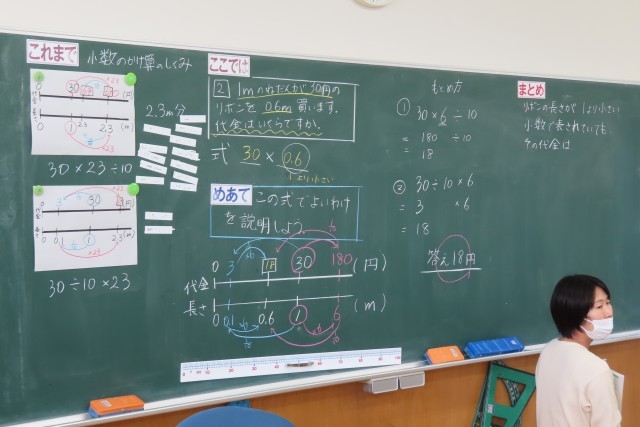 「小数のかけ算」の学習中です。ちょうど教室では「まとめ」をしているところでした。「前回までの計算とはちがうなあ」「でも、考え方は同じだね」ということでした。数直線図を使って考えた結果、このまとめにたどり着きました。自分の頭で考えてたどり着いたまとめなので、しっかり定着していくと思います。