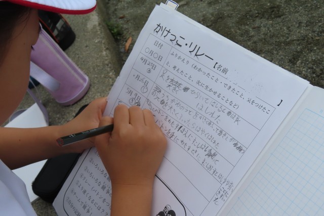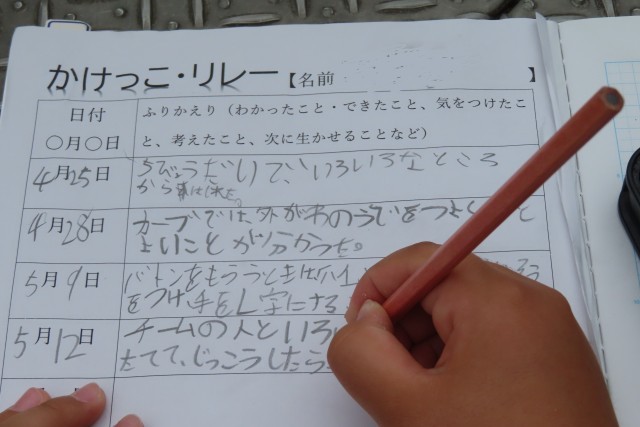 授業前には、校庭まで一直線に走って行き、授業後には「ああ!楽しかった!」とみんな笑顔です。「かけっこ・リレー」をしています。今日はバトンパスを一生懸命チームで練習していました。走っては考え、走っては話し合って。頭も体もたくさん使いました。だから「○秒縮まった!」などと児童の口からは頑張った成果が聞かれます。児童の記入する「ふりかえりカード」には、どの子も、学んだこと、できたことが達成感たっぷりに書かれています。