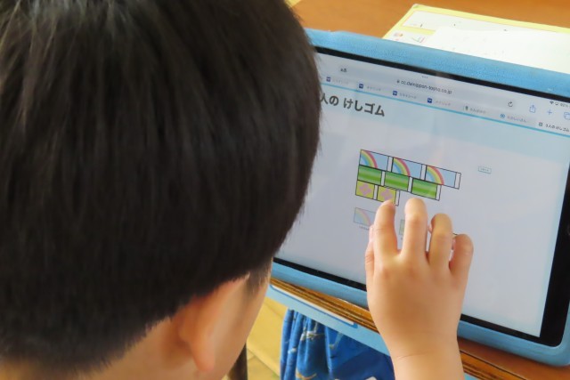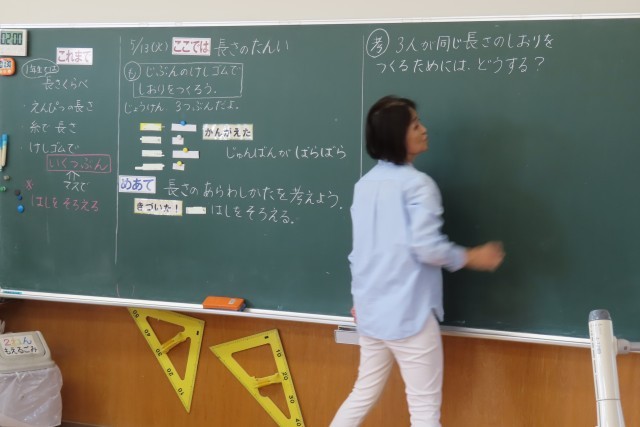 「長さのたんい」の学習に入りました。今日は、消しゴム3つ分の長さでしおりをつくると決めてつくったら、友達のと長さが違ったのはどうしてなのか?同じ長さのしおりをつくるのにはどうしたらよいのか?考えました。「ここでは」長さの単位(cm、mm)を使って長さを表せるようになったり、ものさしを使って長さをはかったり、直線をひいたりすることもできるようになります。生活の中でも、学習でも、いろいろなところで「ここでは」の学習が生かされていきます。楽しみですね!