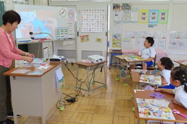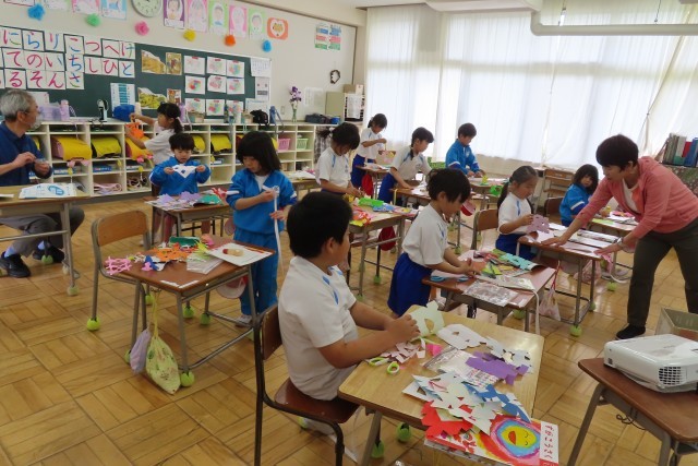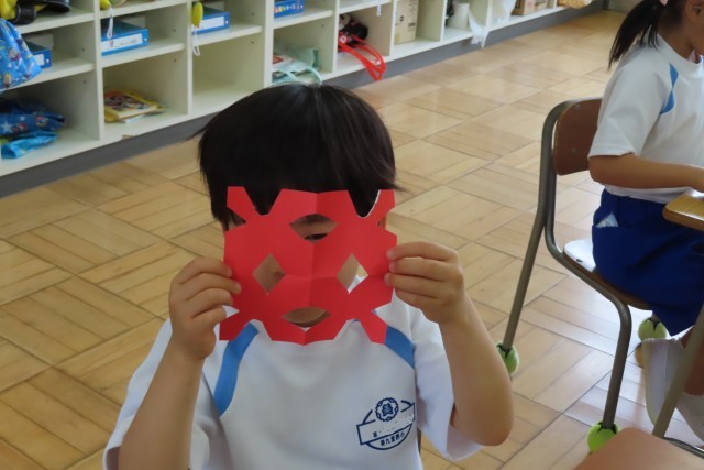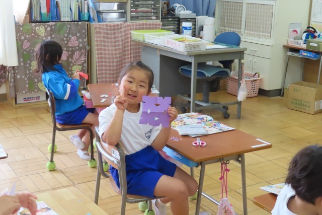 「ちょきちょきかざり」机の上は作品でいっぱいです!そして1年生は作品を持って笑顔いっぱいです!「ここでは」はさみを使って、折り紙の折り方を工夫して切り、いろいろな形が出来上がるのを楽しんでいます。先生が見せてくれるお手本に、身をのりだして見ています。「わたしも やってみたいな!」と夢中でした。どんな飾りが出来上がったのかは、お楽しみに・・・。