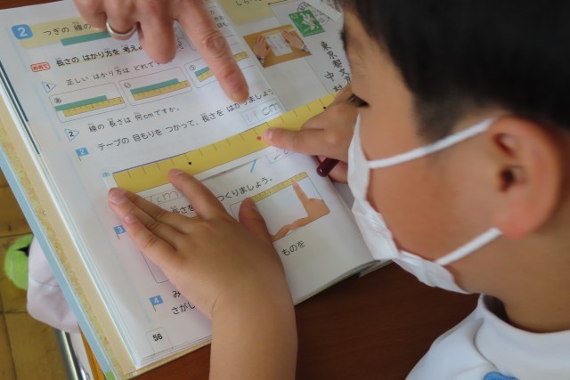 今日は、線の長さのはかり方を学習していました。目盛りのついたテープを使って、はしをそろえて、まっすぐにして。「11めもり あったから、11cm」しっかりはかることができました。線の長さをはかるのがどんどん上手になっていき、いろいろなものをはかりたくなってしまいます。