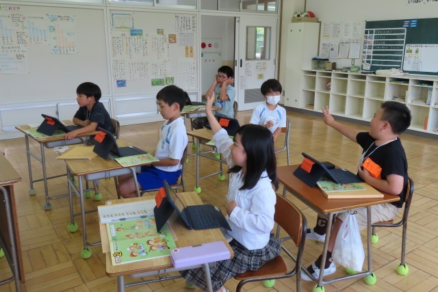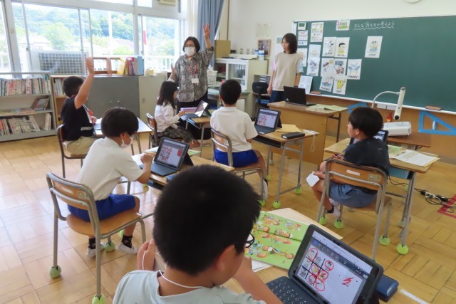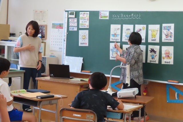 How are you? 気分についてたずねたり言ったりする英語を、とても楽しみながら慣れ親しんでいます。聞いてみたい!言ってみたい!というやる気いっぱいな3年生の外国語活動の授業では、担当の先生、ALTの先生、そして友達と笑顔いっぱいに英語を言ったり聞いたりすることを楽しんでいます。