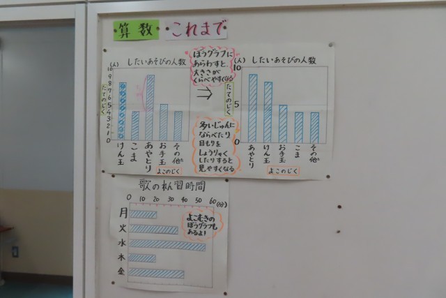 「ぼうグラフと表」の学習では、ぼうグラフの正しい読み取りができるようになりました。2つのぼうグラフ(ケガ防止の呼びかけ前後のケガ人の人数変化)から、数を正しく読み取るには、目盛りの取り方をよく確認しないとならないことに気付きました。「このあとは」自分が調べてみたいことなどを上手に分かりやすく整理して分析したり伝えたりすることができるようになります。