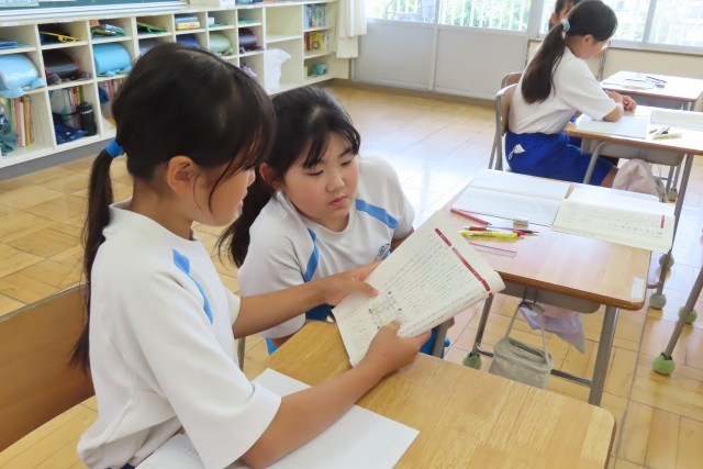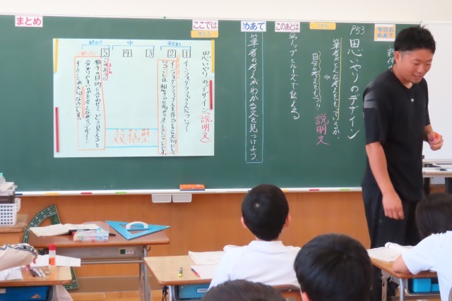 「思いやりのデザイン」の学習中です。「これまで」3年生のときまでに学習してきた説明文の形とちょっと違う形の説明文を学習するようです。「ここでは」4年生になって学習する説明文との違いに関して、先生から一つ児童に質問がありました。教室ではそのことについて一生懸命友達と話をしています。先生が納得できるような分かりやすい説明を真剣に考えていました。ここでの学習がかなり充実すること間違いありません!