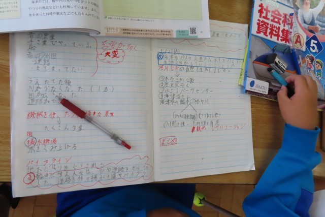 「低い土地のくらし」の学習中です。今日は、海津市の人々は豊かな水をどう生活に生かしたかを学習しました。振り返りの時間には、「ここでは」学んできたことに関する動画を見ました。5年生は、学習したことがよく確認できたとともに、自分の暮らすここ藤岡での生活と比較しながら見ていたように感じました。そして日本に限らず世界にはいろいろな土地の違いがあり、それぞれの地形の特色を生かした生活をしているということにも気付くことができました。