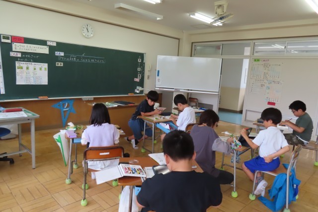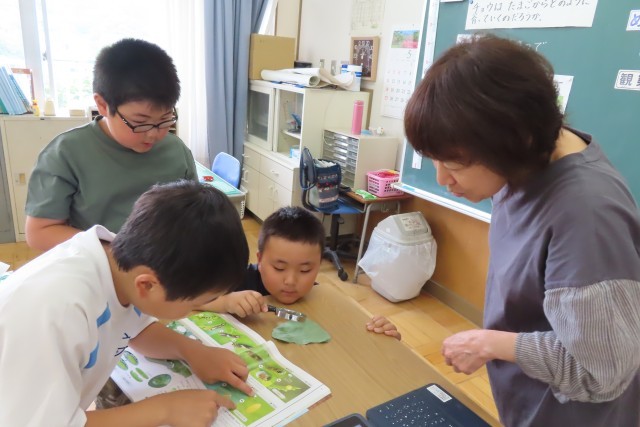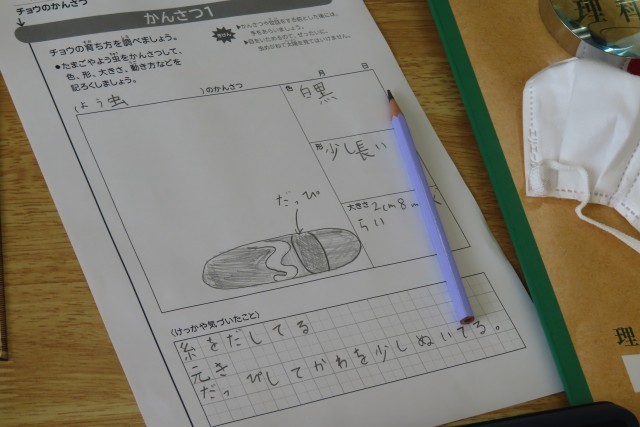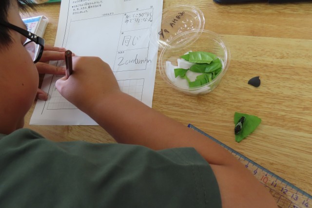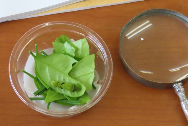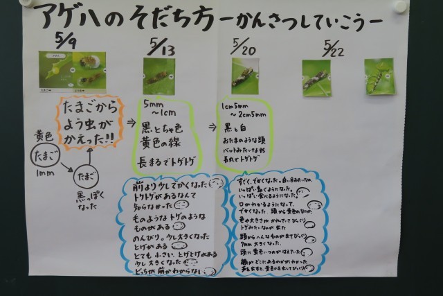 アゲハチョウの育ち方の観察を続けています。今日も昨日とは違う変化が見られ、3年生は大興奮状態でした。「今朝、見たら、脱皮していたよ!」毎日毎日愛情込めて大切に観察を続けているので、小さな変化にもよく気が付きます。また、先生が持ってきて学校に植えておいたキャベツの葉っぱに小さな卵がついていたのを発見し、こちらも大喜びです。実際に卵からどう育つかをこんなにじっくり見て観察をすることができた「ここでは」の学習はとても価値のあるものをたくさん得られたと思います。