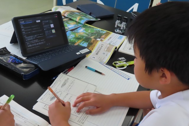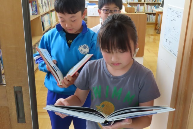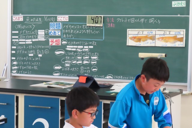 「魚のたんじょう」の学習に入りました。調べてみたいことがたくさん!目が輝いていました!今日はまず、メダカのオスとメスの体の違いについて調べます。タブレットを使って調べる子もいましたが、真っ先に図書室に向かっていく子が多くいました。調べ方それぞれですが、図書室の司書さんがとても喜んでいました。自分にとってどんな方法がいいかな?調べたいことによって自分でこうしてしっかり考えることができ、図書資料もインターネットも両方を上手に使えるようになるといいですね。