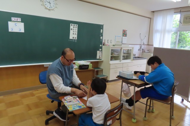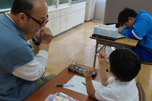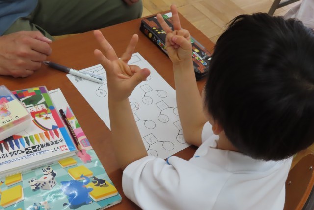 1年生が算数「いくつといくつ」どんどんできるようになっています。先週まではおはじきやブロックを使って考えていましたが、今日は自分の指を使って考えていました。おはじきやブロックがなくても、じぶんでできるよ!とても嬉しそうでした。