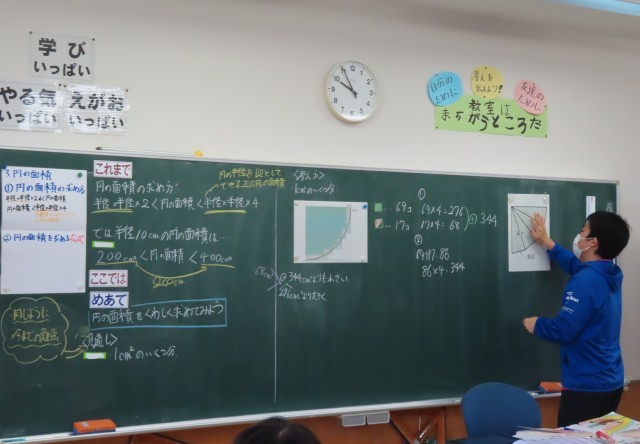 「円の面積」の学習に入りました。先週は「これまで」5年生のときに円周の長さの見当をつけたときの学習をよく思い出したところから「ここでは」の学習が始まったばかりです。今日は円の面積の詳しい求め方を考えていました。そして「ここでは」そんな学習を経て、円の面積が計算で正確に(公式を使って)求めることができるようになります。どうしてこの公式ができるのか?じっくり細かく丁寧に考えるここでの学習があるからこそ、「ここでは」学習して得ることの大切さを実感することでしょう。