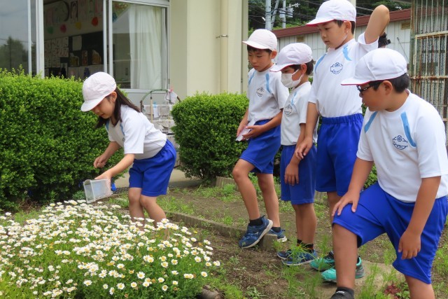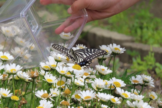 理科の授業の最後に、アゲハチョウを花壇に放してあげました。ずっと見守って育ててきたので、寂しい気持ちでいっぱいでしたが、思い切って手放しました。感動的な瞬間でした。すると、3年生が「旅立ちの日に」を歌い始めました。さらに感動しました。まだこのあともアゲハチョウになる準備をしている幼虫やさなぎがいます。どんなきれいなチョウになって飛び出していくか楽しみです。そして、こうやって大切に観察して育てていくにつれて、3年生の表情がどんどん優しくなっていくのを感じています。