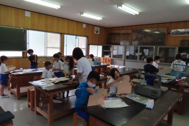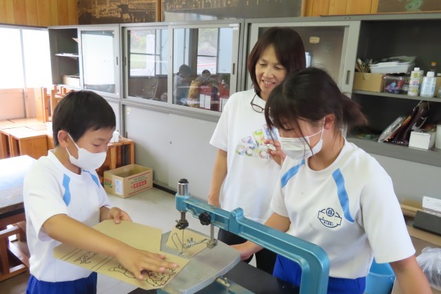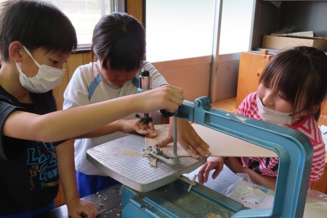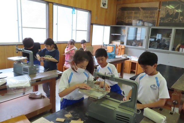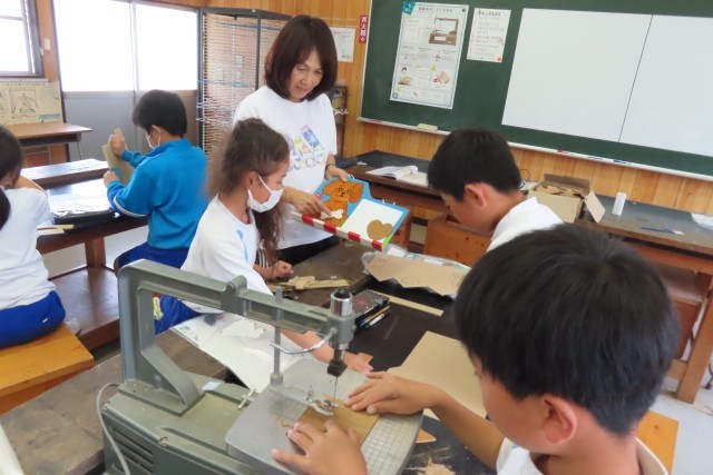 「糸のこスイスイ」です。「ここでは」電動のこぎりを使って自由な線で板を切ってホワイトボード伝言板をつくります。同じ班の友達と声をかけあって安全第一、慎重に、でも楽しそうに作業を進めていました。切って残った板も何か工夫を加えてみると作品の一部になるかも!先生が見せてくれる見本を見てアイデアが浮かんだ児童がいたようです。