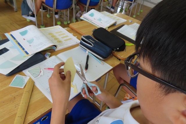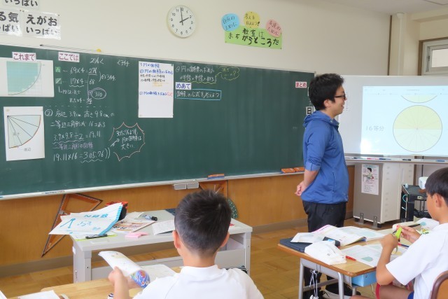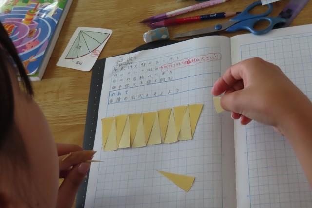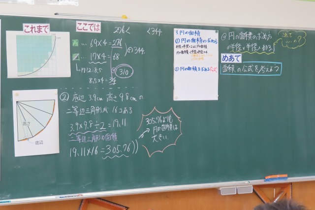 「円の面積」授業の始まりの段階では、円の面積を「半径×半径×約3.1」で求めるというところまで時間をかけて考えました。でも果たしてそれでよいのか?今日は、円の面積を求める公式を考えました。「これまで」学んできた面積の求め方が分かっている図形とつなげて考えてみるようです。引き続き、時間をかけて、じっくりと考え始めました。円を細かく等分して並べかえてみて考え始めました。