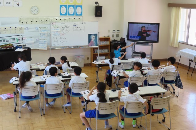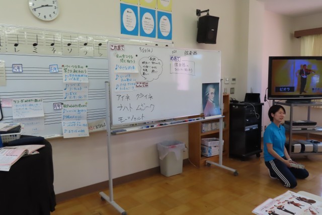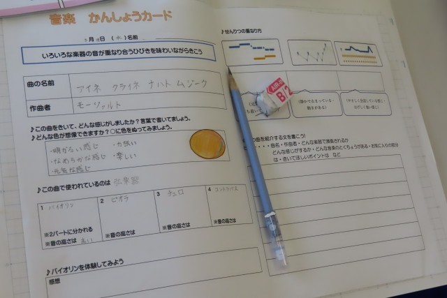 「アイネ クライネ ナハトムジーク第1楽章」を聴いて学習です、この曲は弦楽器で演奏されているので、「ここでは」弦楽器(4種類)について知ります。ちょうど音楽室では、バイオリン、ビオラ、チェロ、コントラバス、それぞれの音を聴いたり、演奏の仕方を見て比較したりして、それぞれの楽器の特徴に気付きました。そしていろいろな楽器の音が重なり合う響きの美しさを味わいながら鑑賞します。