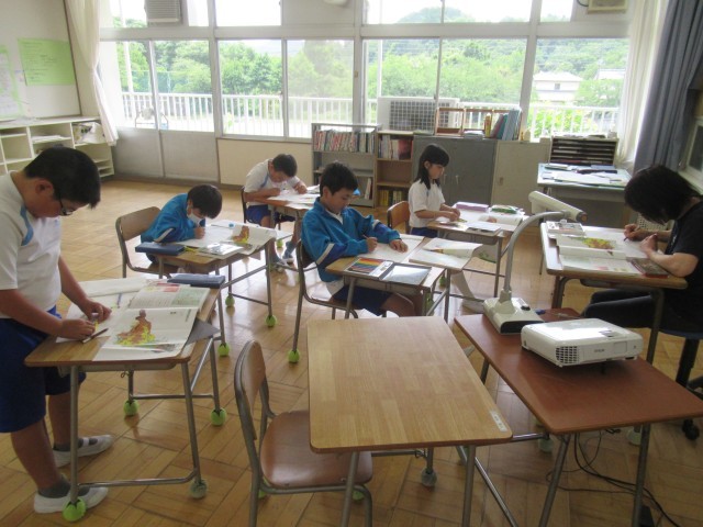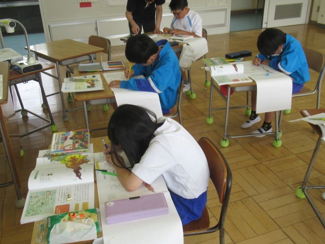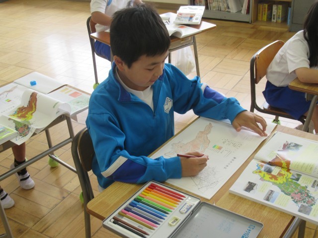 3年生は社会科で藤岡市の学習を進めています。この時間は地形図の色塗りをしていました。地形ごとに色を分けて塗っていきます。細かな作業ですが、塗り進めていくと、いろいろな発見があります。みんな集中して取り組んでいました。