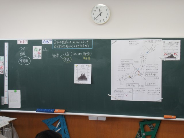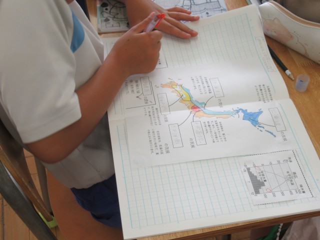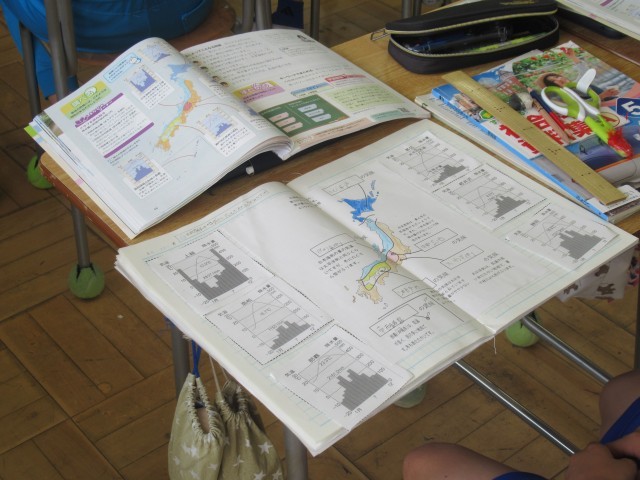 5年生は日本の気候について学習しています。それぞれの地域ごとの気候の特色を、「雨温図」を使って捉えていきます。3年生と同じように、子供たちは自分で色分けした日本地図を活用しています。各地域に該当する雨温図を貼り、日本全体の気候の特色を捉える資料が完成していきます。