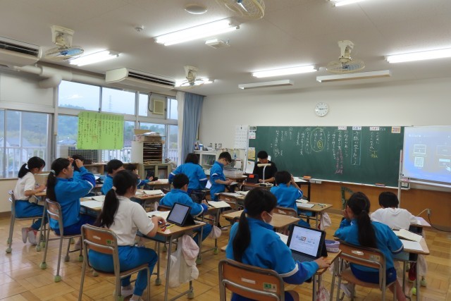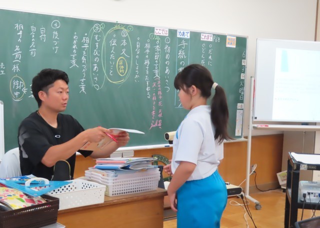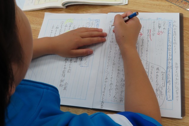 「お礼の気持ちを伝えよう」の学習です。「ここでは」自分の気持ちが伝わるように内容を考え、手紙の形(あいさつ、本文、むすび、後づけ等)にそって、手紙をおくることができるようになります。近年、メールなど相手とのメッセージが電子化されて便利な時代ですが、こうして、相手のことを考えながら内容を考えて自分の字で書いて手紙をおくるという経験はいつまでも児童の中で大切にしてほしいと心から思いました。