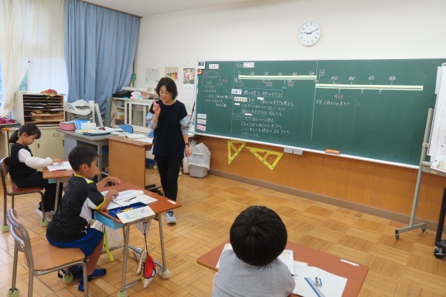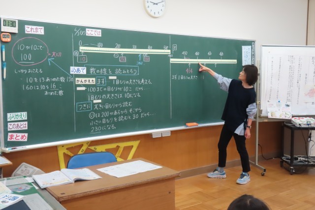 「100より大きい数」の学習です。今日は、「数の線」を読むことができるようになりました。1目もりの大きさを考えて、大きい目もりから読んで・・・が分かったので、どんどんいろいろな「数の線」を読んでみたくなっていました。先生からプリントが配られると、「やりたい!」「やりたい!」と「やる気いっぱい」の声をあげて、とってもよく頑張っていました。「できた!」「わかった!」はどんどん児童の力をつけていくのです。