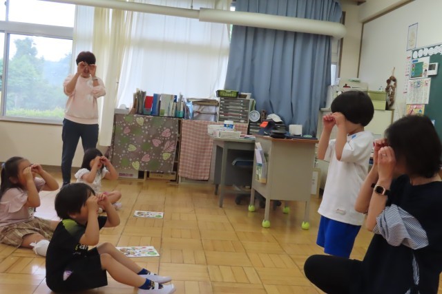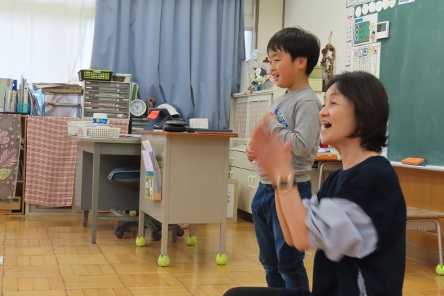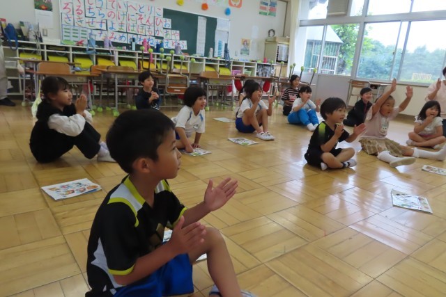 お友達のほうをよく見て、よく聴いて、よく考えて、ことばのリズム遊びを楽しんでいました。1・2年生の音楽の学習は、いつもいろいろな活動があって、1時間の学習のなかで、たくさんの歌声や手拍子や楽器の演奏がきこえてきます。いっぱい体を動かしながらとても楽しそうです。お友達や先生と一緒にみんなで音楽を楽しんでいます。