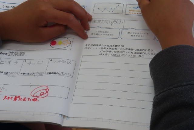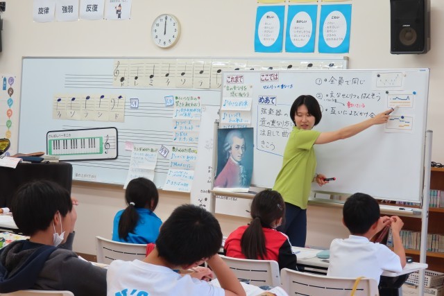 「アイネ クライネ ナハトムジーク第1楽章」を聴いて学習しています。ちょうど音楽室では、弦楽器の音の重なり方に意識を集中させて聴いていました。全員で同じ旋律を演奏しているから、元気な感じがする!などよく聴いていました。旋律の重なり方が変わっていくことや弦楽器それぞれの特徴を生かした響きの美しさを味わって鑑賞してほしいです。