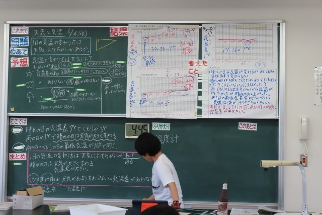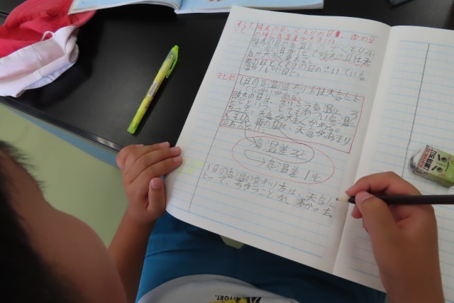「天気と気温」の学習の最後、「ふりかえり」をしていました。「ここでは」の学習を通して学んだこと、さらに知りたいことなど、自分のことばでノートに書いていました。天気の様子について追究してきて学んだことを、「このあとは」これまで以上に生活の中で、自分で考えて判断できるようになることが増えていきます。特にこれから暑くなる時期に「ここでは」学んだことが大活躍するといいですね!